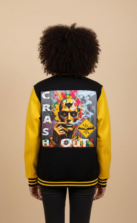 Letterman Jacket — ‘Crash Out’ Graphic Varsity Jacket with Neon Clown Design