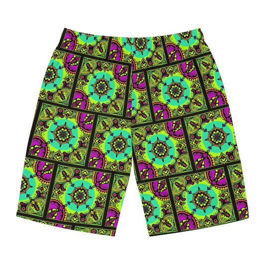 "Ungodly Purple and Green Paisley" Colorful Men's Board Shorts, Summer Swimwear for Beach Days, Tropical Vacation Shorts, Gift for Him, Pool Party Attire