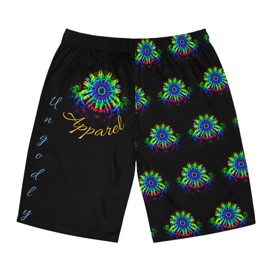 "Stoner Bitches" Trippy Graphic Board Shorts, Funky Summer Swimwear, UnGodly Apparel, Beach, Festival, Edgy Swim Trunks, Colorful Vacation Shorts