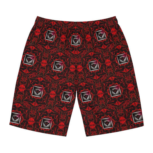 "Ungodly Red Paisley" Men's AOP Board Shorts - Bold Red Heart Design, Summer Swimwear, Beachwear, Vacation, Gift for Him, Pool Party Essentials