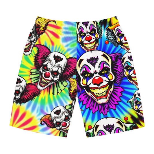 "Killer Clown" Vibrant Clown Print Men's Board Shorts, Summer Beachwear, Fun Swim Trunks, Festival Attire, Colorful Vacation Shorts