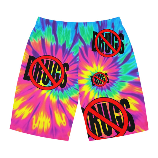 Vibrant Tie-Dye Board Shorts with 'No Drugs' Design, Summer Swimwear, Beachwear, Festival Shorts, Men's Casual Shorts, Colorful Swim Trunks