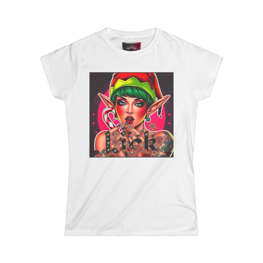 Candy Cane "Lick" Elf pinup -Women's Softstyle T-Shirt- Fun Holiday Elf Design
