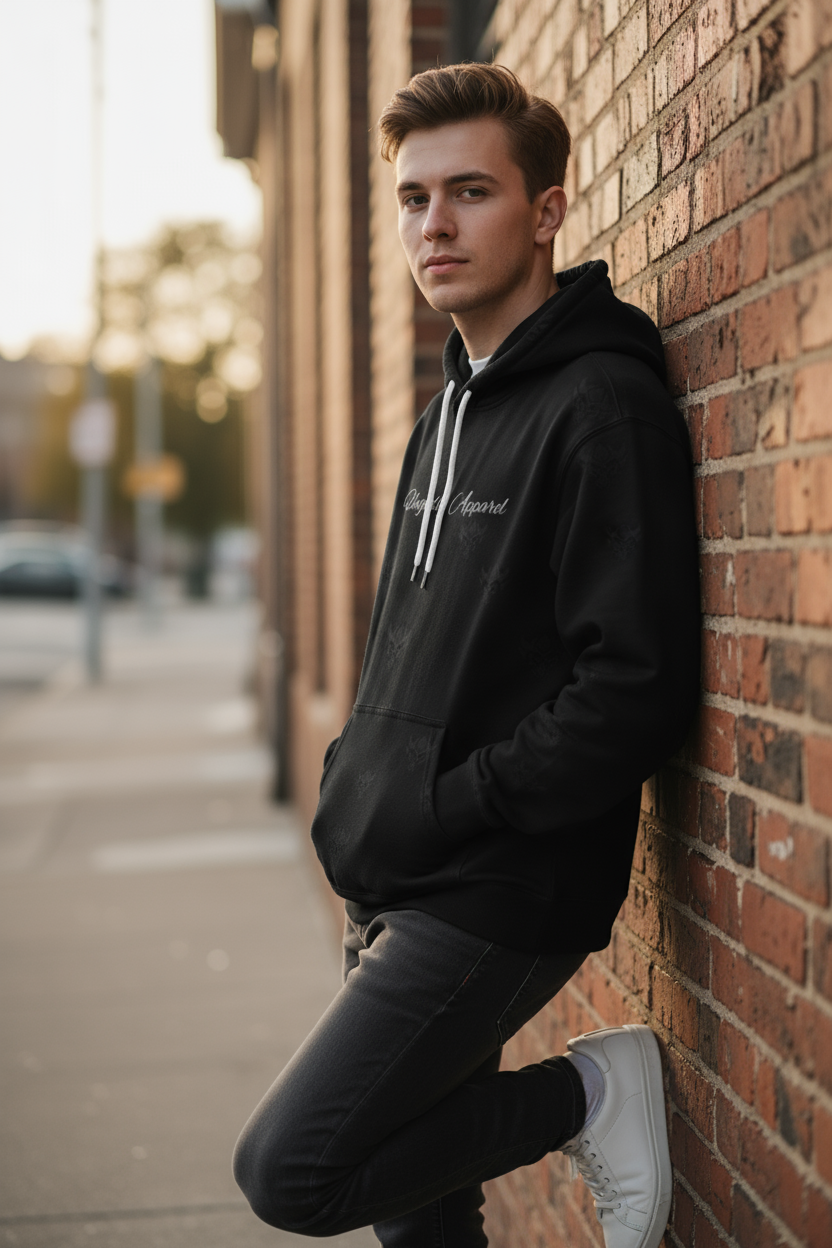 This soft, recycled-poly hoodie brings quiet edge and everyday comfort together. The matte black base carries a subtle repeating emblem that reads as texture from a distance and reveals delicate detail up close. Lightweight but substantial, it moves easily through commutes, late-night walks, and layered outfits. The adjustable hood and clean black drawstrings frame the face while a roomy front pocket keeps hands warm. Finished with a sewn care label and the option for a custom inside waistband tag, it feels thoughtful and personal — a low-key statement piece that settles into your rotation and becomes the one you reach for when you want something both comfortable and intentionally styled.