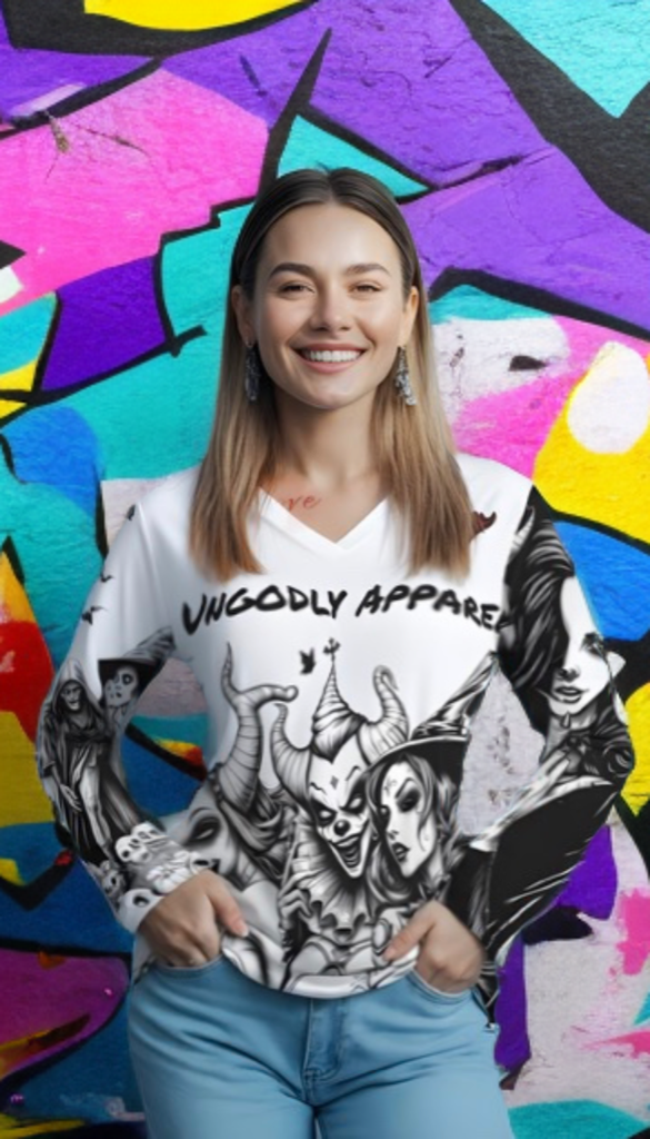 Elevate your style with this striking Women's Long Sleeve V-neck Shirt, perfect for those who embrace a unique, edgy aesthetic. The shirt features an eye-catching design that embodies a bold spirit, making it a fantastic choice for casual outings or lively gatherings. Ideal for the free-spirited and those who love to stand out, this shirt seamlessly fits into your wardrobe, bringing a fierce vibe to everyday wear. Perfect for Halloween parties, music festivals, or just expressing your individuality in daily life, it's a must-have for anyone looking to make a statement.