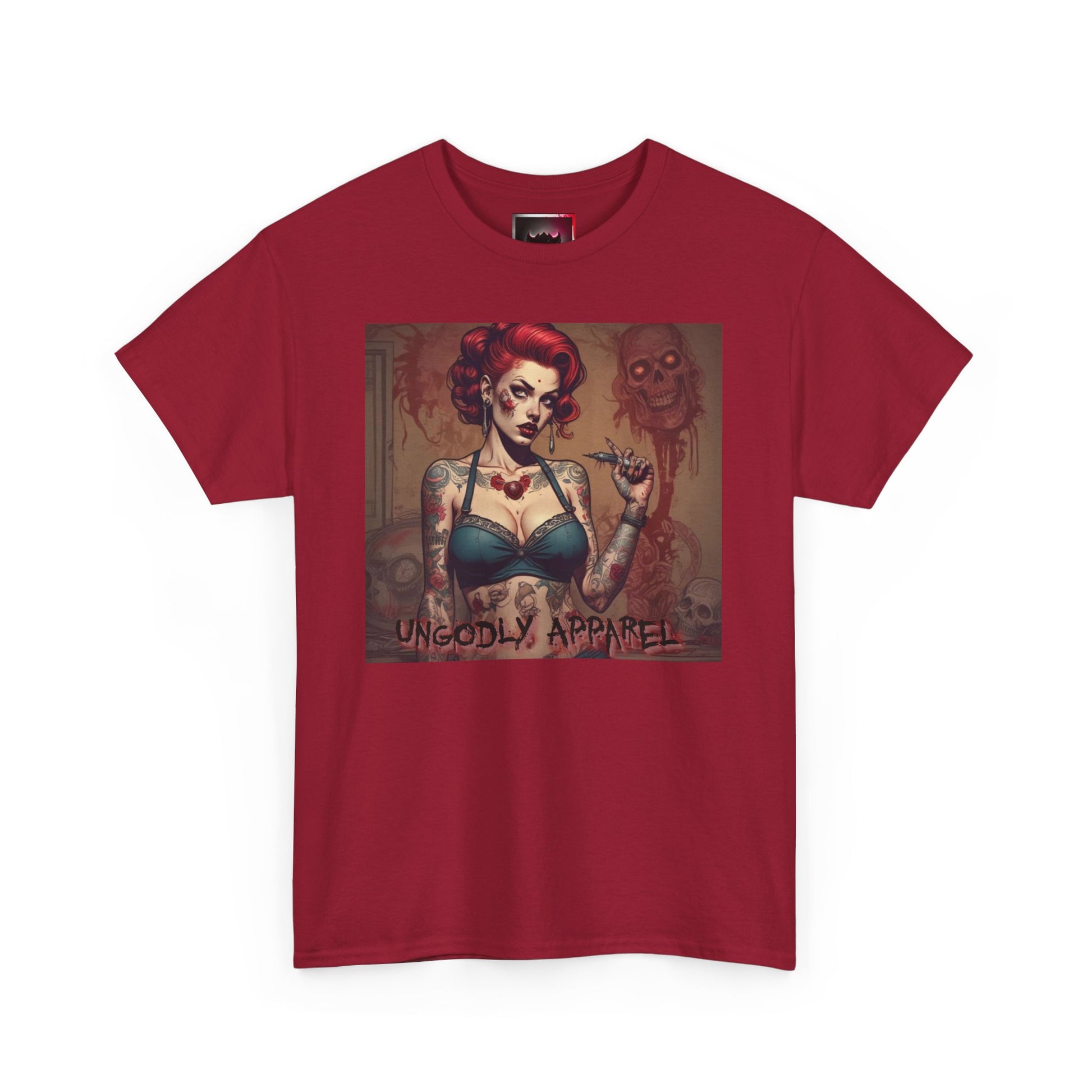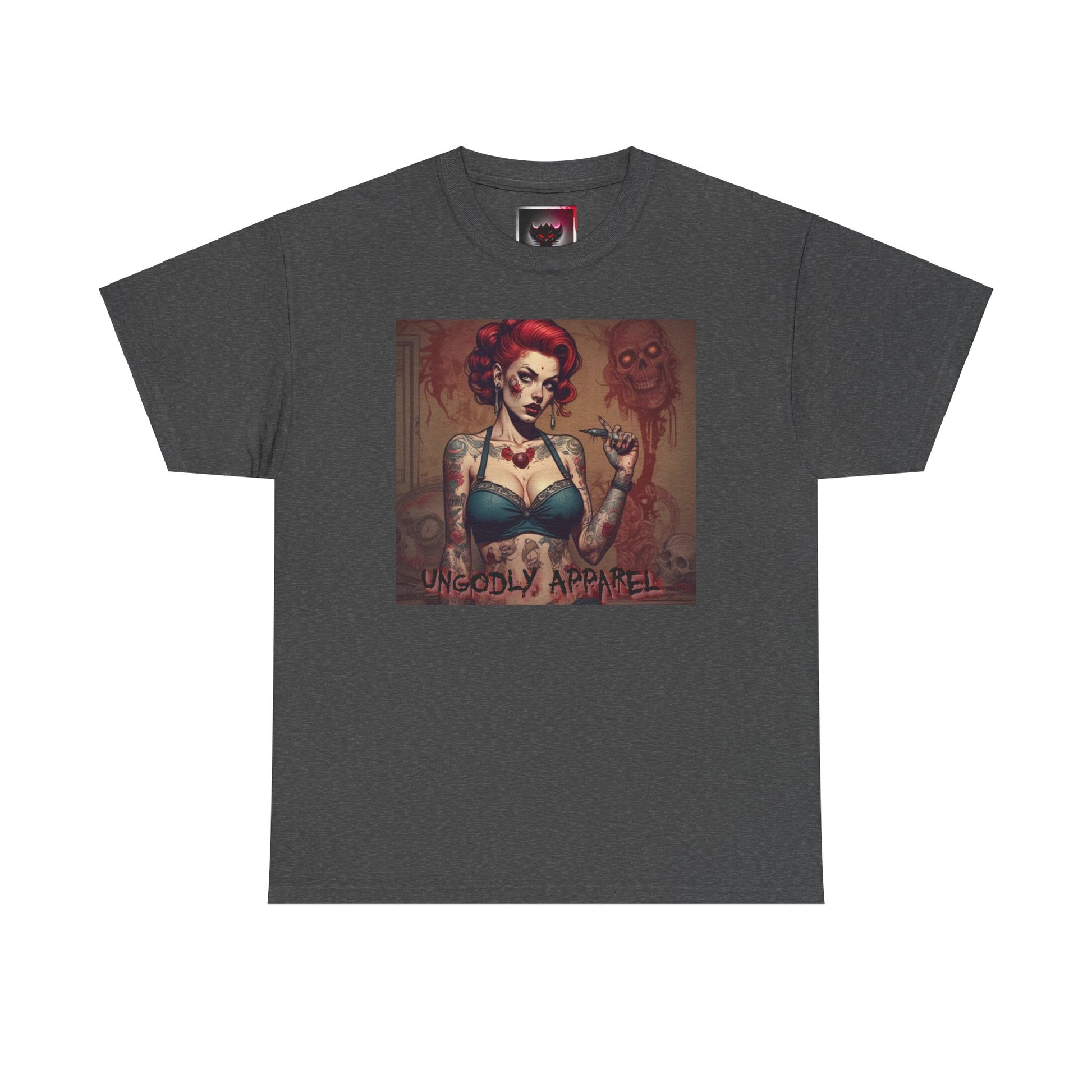 Gothic Zombie Girl Tattoo Print Unisex Heavy Cotton T-Shirt - Perfect for Alternative Fashion Lovers