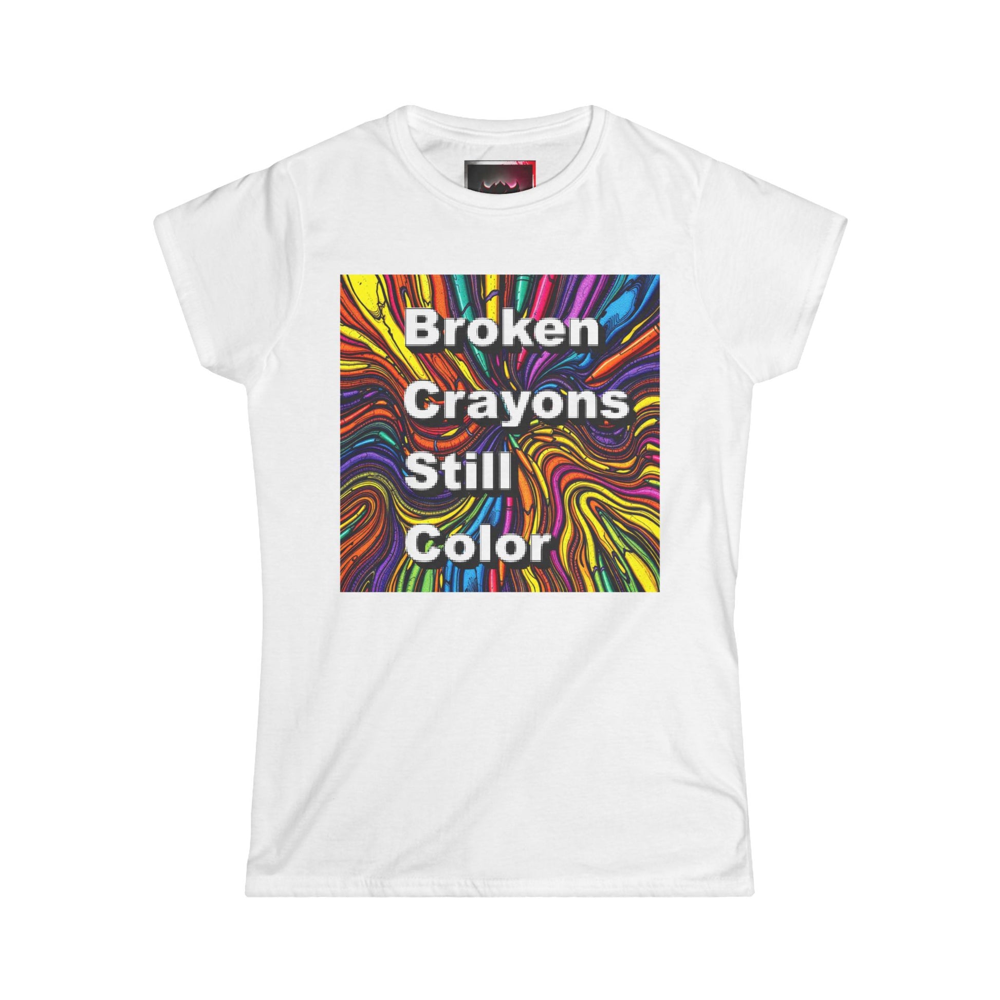 Introducing this vibrant Women's Softstyle Tee, perfect for expressing your unique personality and positive outlook on life. Featuring a lively design that reads, "Broken Crayons Still Color," this tee embodies resilience and creativity. It's an ideal choice for anyone who appreciates art, self-expression, or simply spreading joy wherever they go.