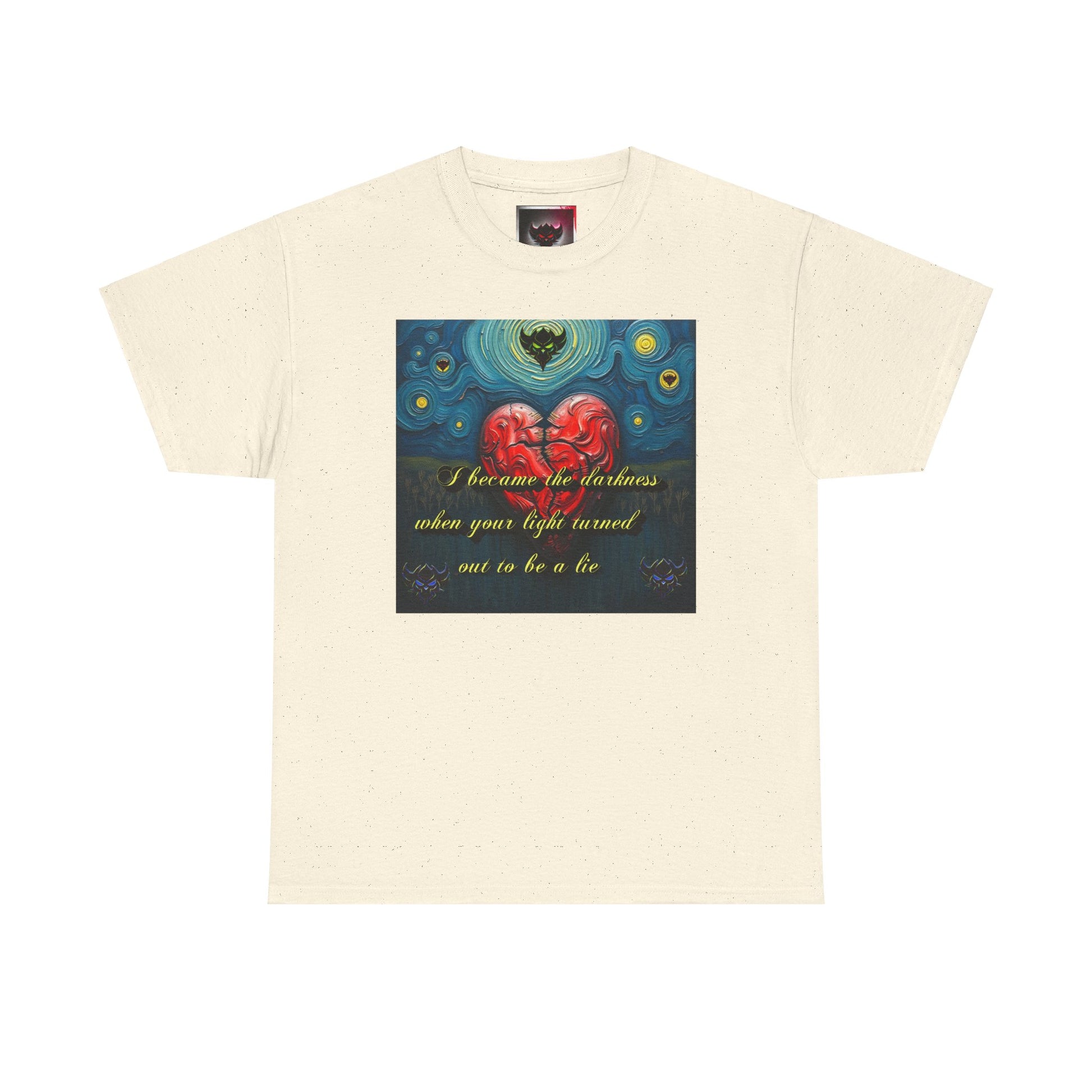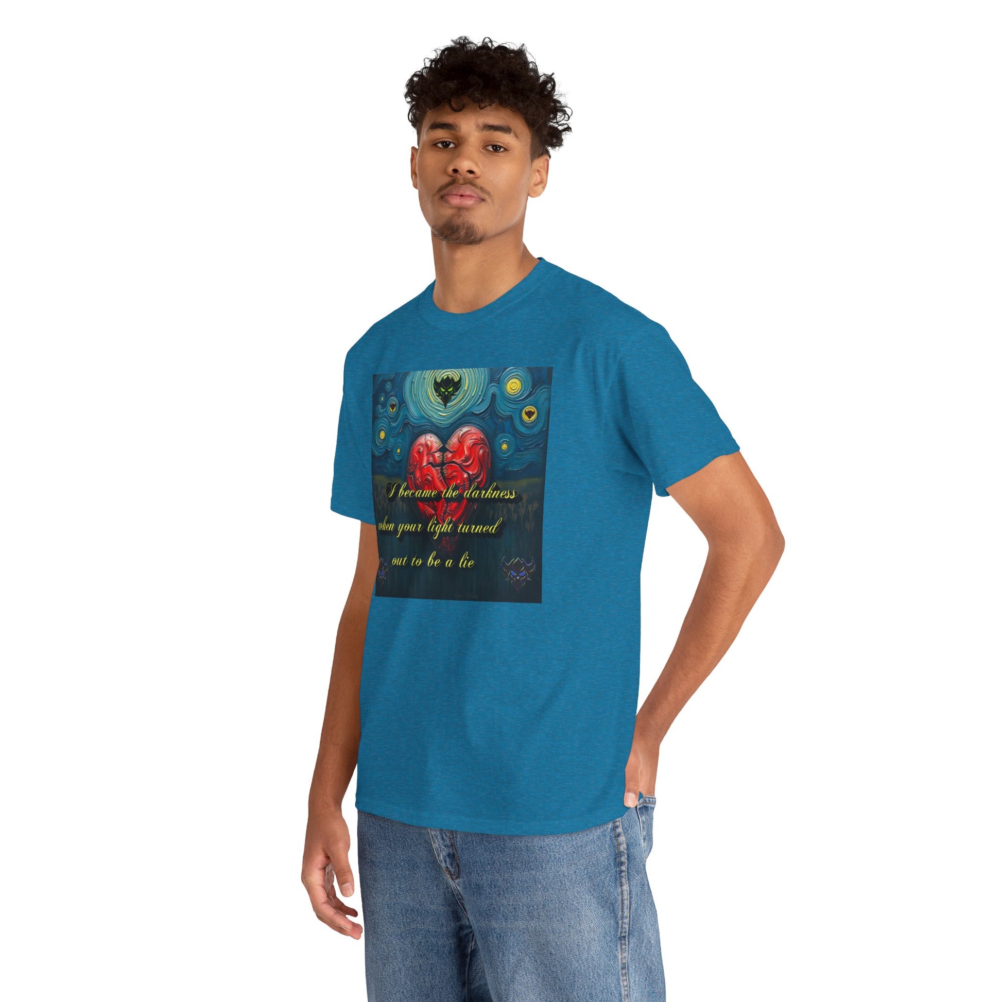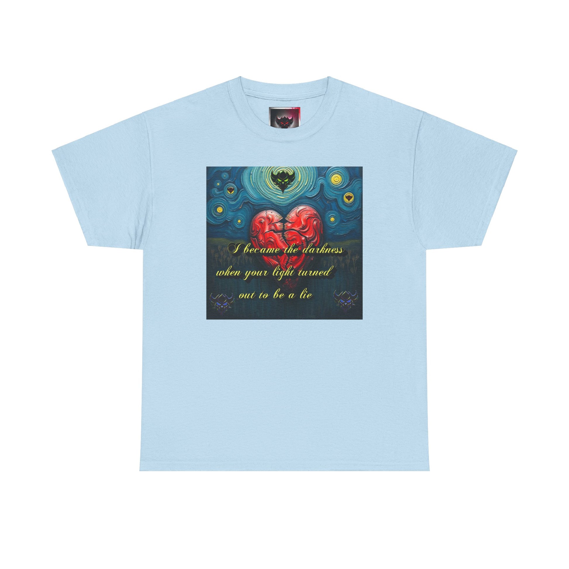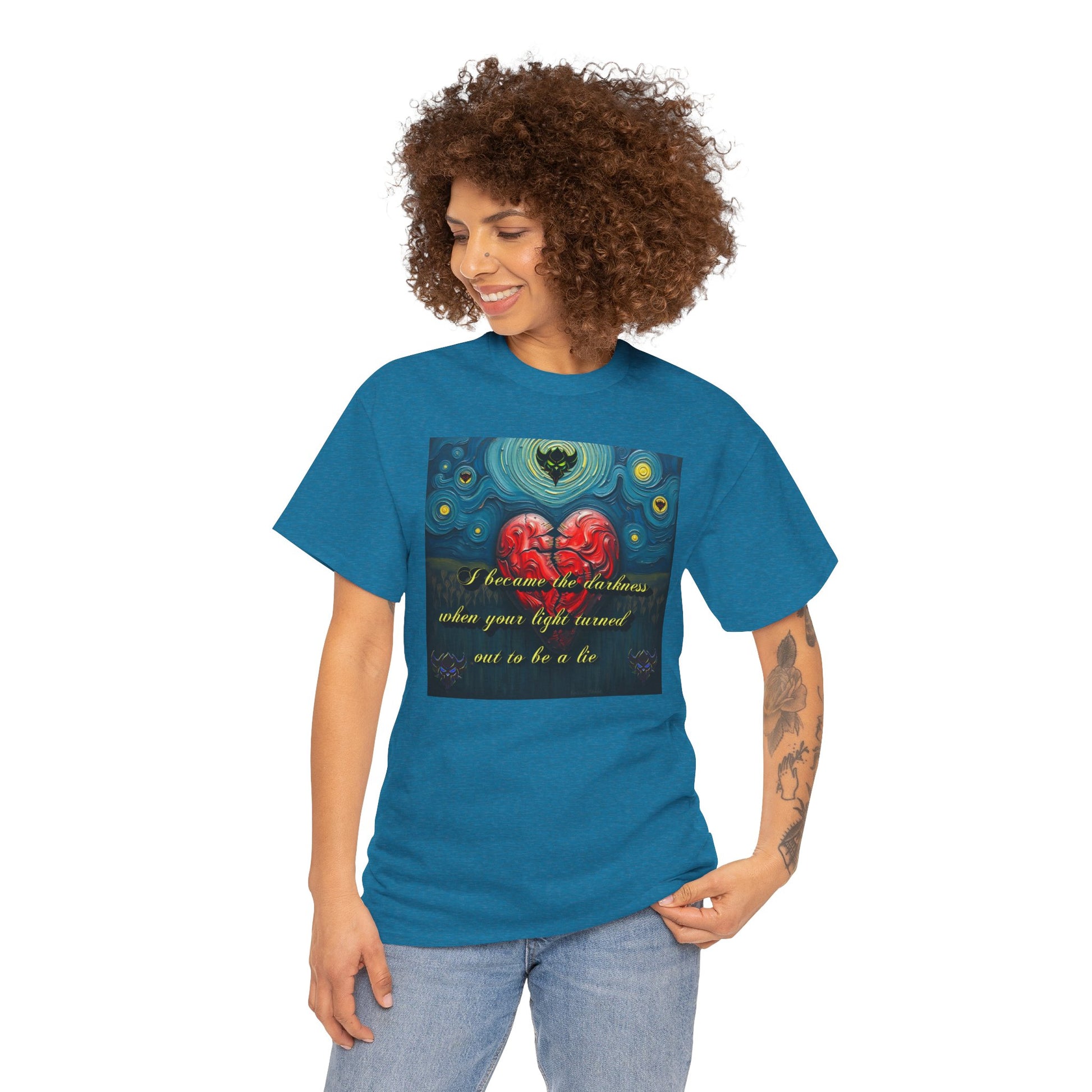 Inspiring Unisex Heavy Cotton Tee - "I Became the Darkness When Your Light Turned Out to Be a Lie" Design