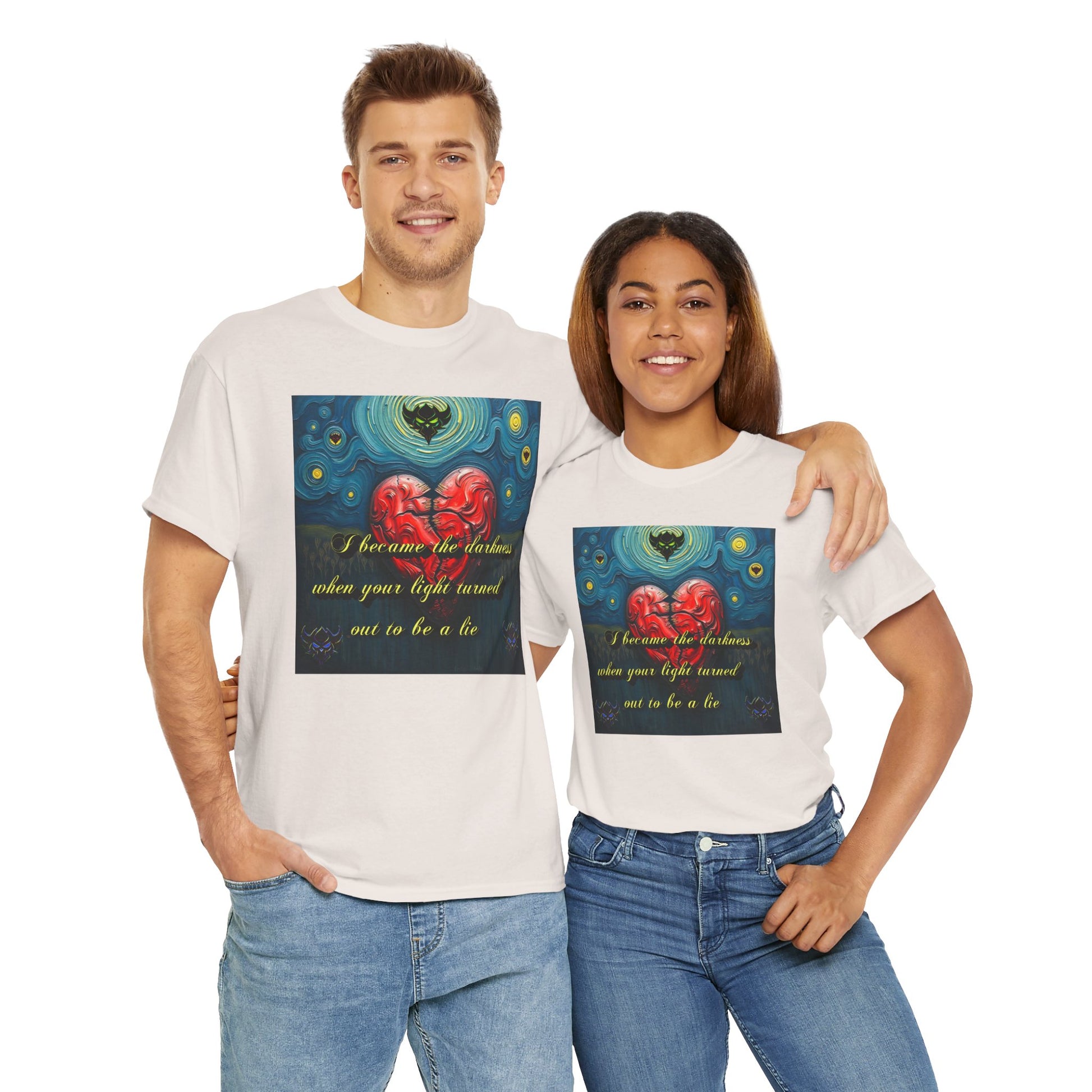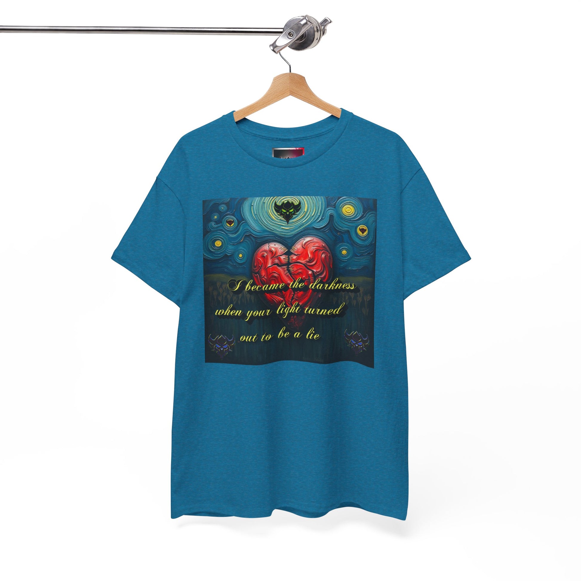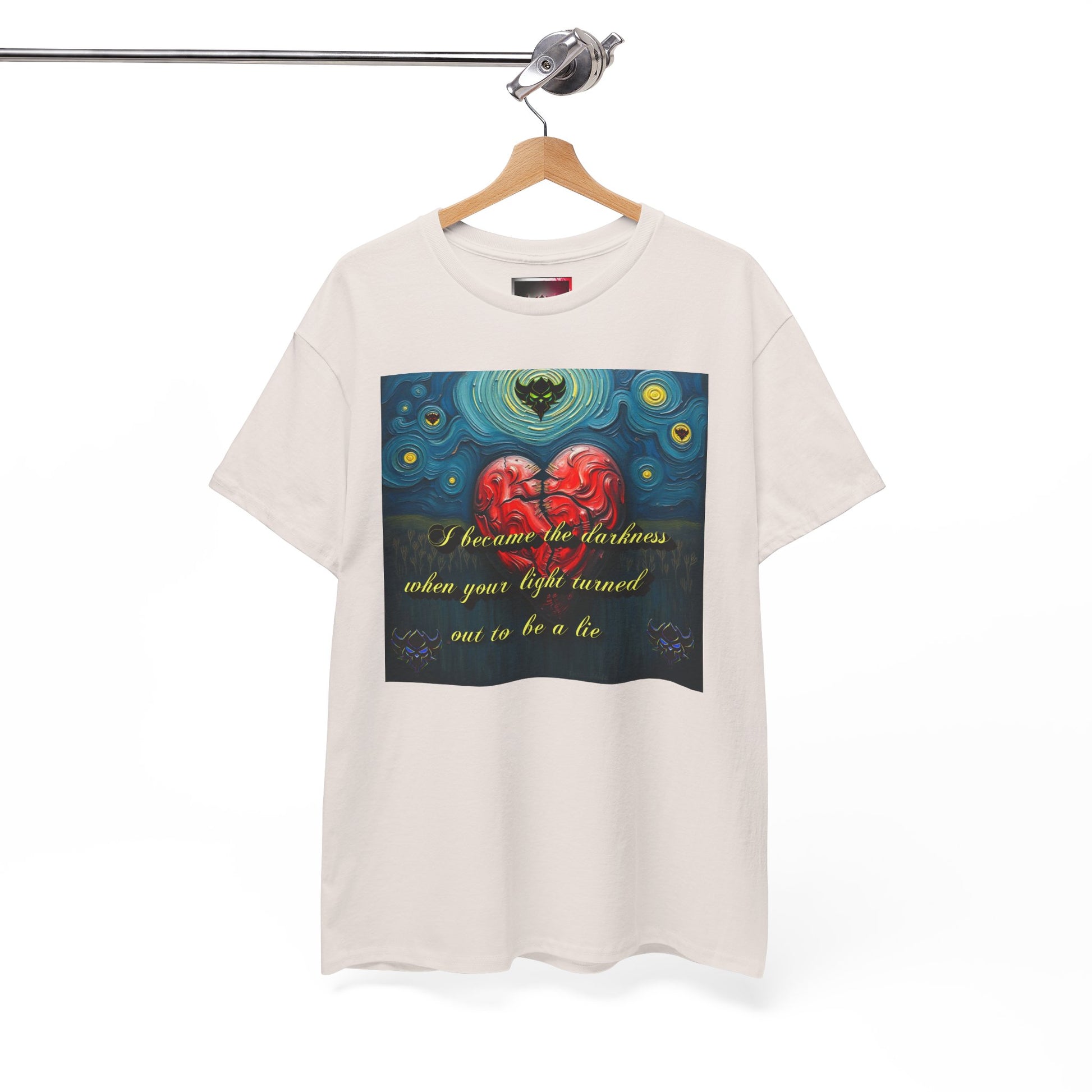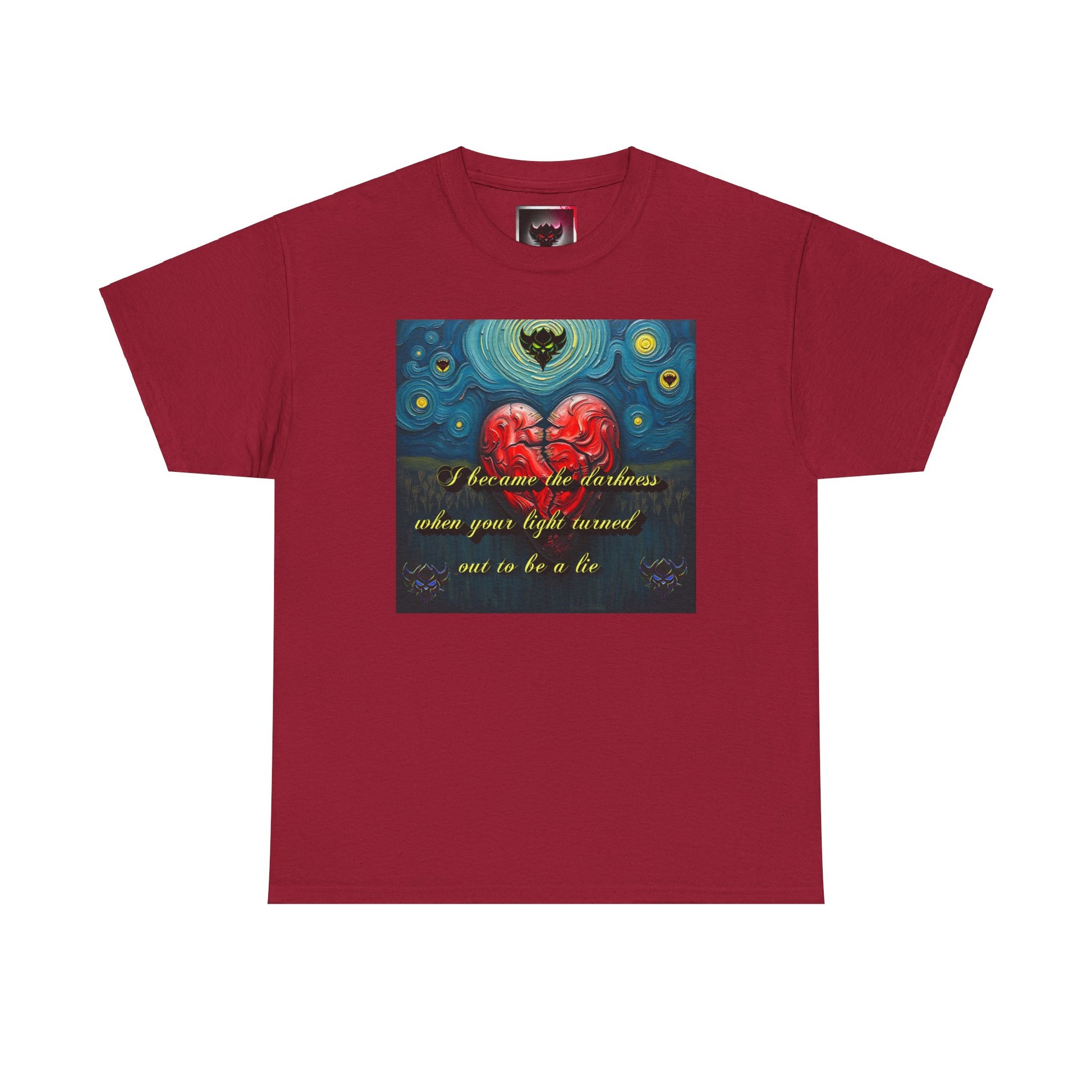 Inspiring Unisex Heavy Cotton Tee - "I Became the Darkness When Your Light Turned Out to Be a Lie" Design