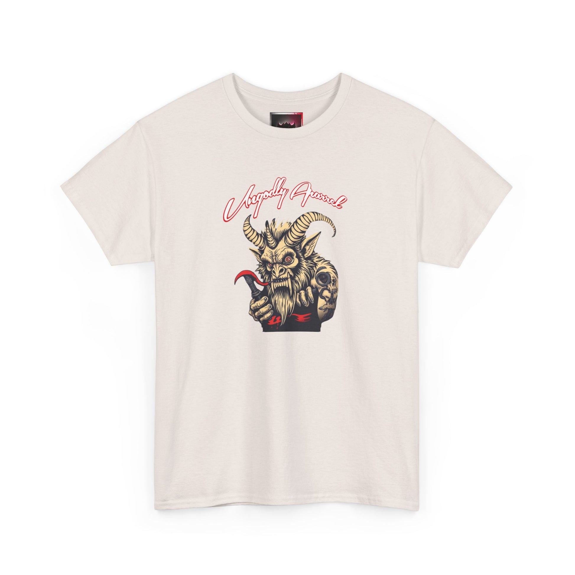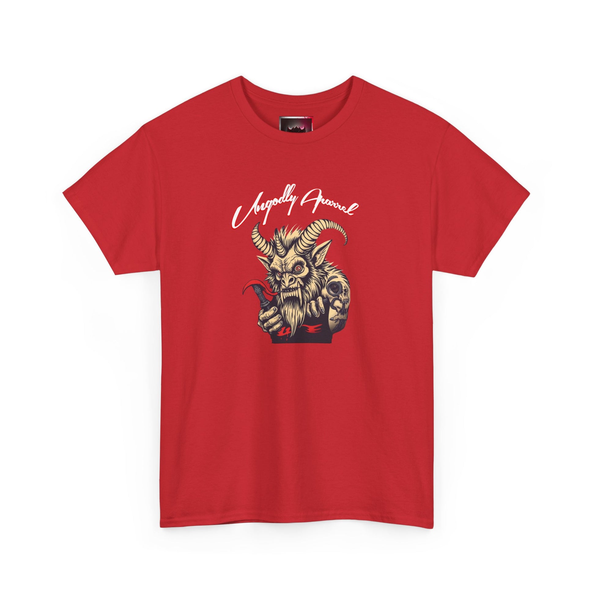 Wear a little mischief with this soft, sturdy tee. The front art — a horned, mischievous creature holding a candy cane beneath hand-lettered script — feels like a midnight sketch pulled from a roadside tattoo flash sheet. It sits low on the chest, bold but not shouty, so the shirt reads like a personal emblem rather than a billboard. The fabric is smooth and substantial, the crew neckline holds its shape, and the relaxed cut moves easily through the day. This is for people who lean into dark-humor style: skateboarders, tattoo fans, late-night music-goers, and anyone who likes one-of-a-kind graphics layered under a jacket or worn solo during holiday hangs. It carries a playful, slightly sinister vibe that fits winter parties, alternative holiday gatherings, band meetups, or just walking the streets with friends. The tee’s durable print and ethical cotton make it a piece you’ll reach for when you want to say something with your clothes — wry, a little wicked, and unmistakably yours.