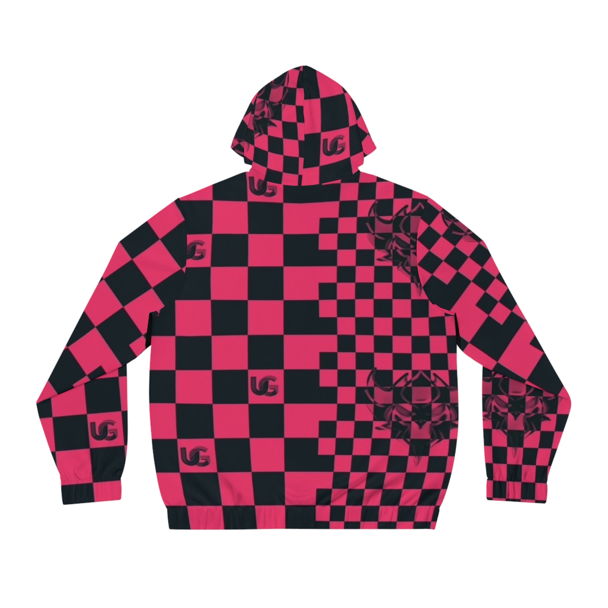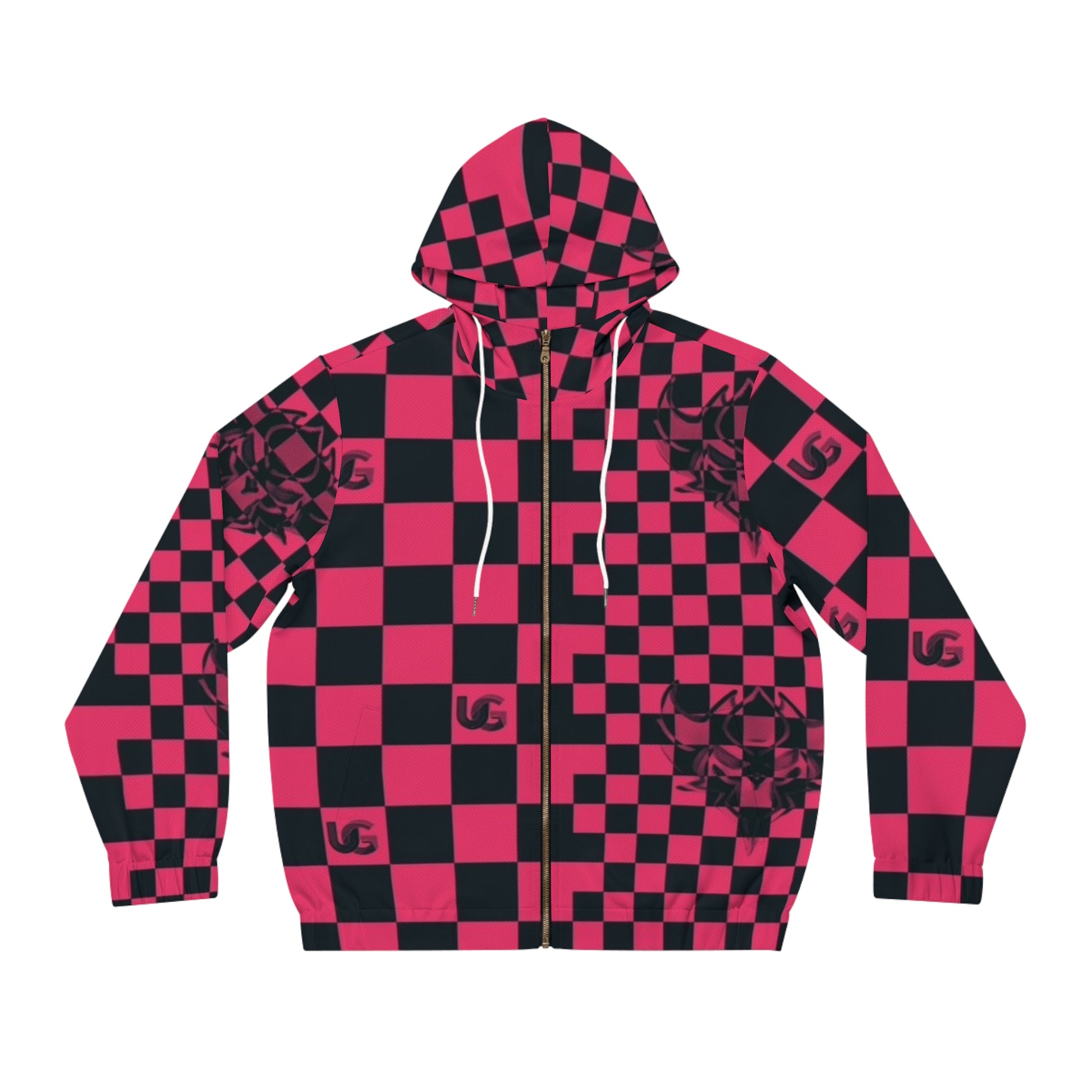 This zip-up hoodie brings bold street energy with its eye-catching checkerboard pattern in hot magenta and deep black. The all-over print mixes large and small checks with subtle repeating emblem details, giving it a layered, graphic look that reads both playful and edgy. Lightweight stretch knit (95% polyester, 5% spandex) keeps the fit clean and mobile, while elastic cuffs and hem lock in shape for repeated wear. A gold-colored metal zipper, adjustable hood with drawcord, and slanted front pockets add useful, durable touches. Wear it to add a confident, punk-inspired flair to skate sessions, late-night hangs, or city commutes — it sits naturally in wardrobes that favor statement layering and bold color contrast.