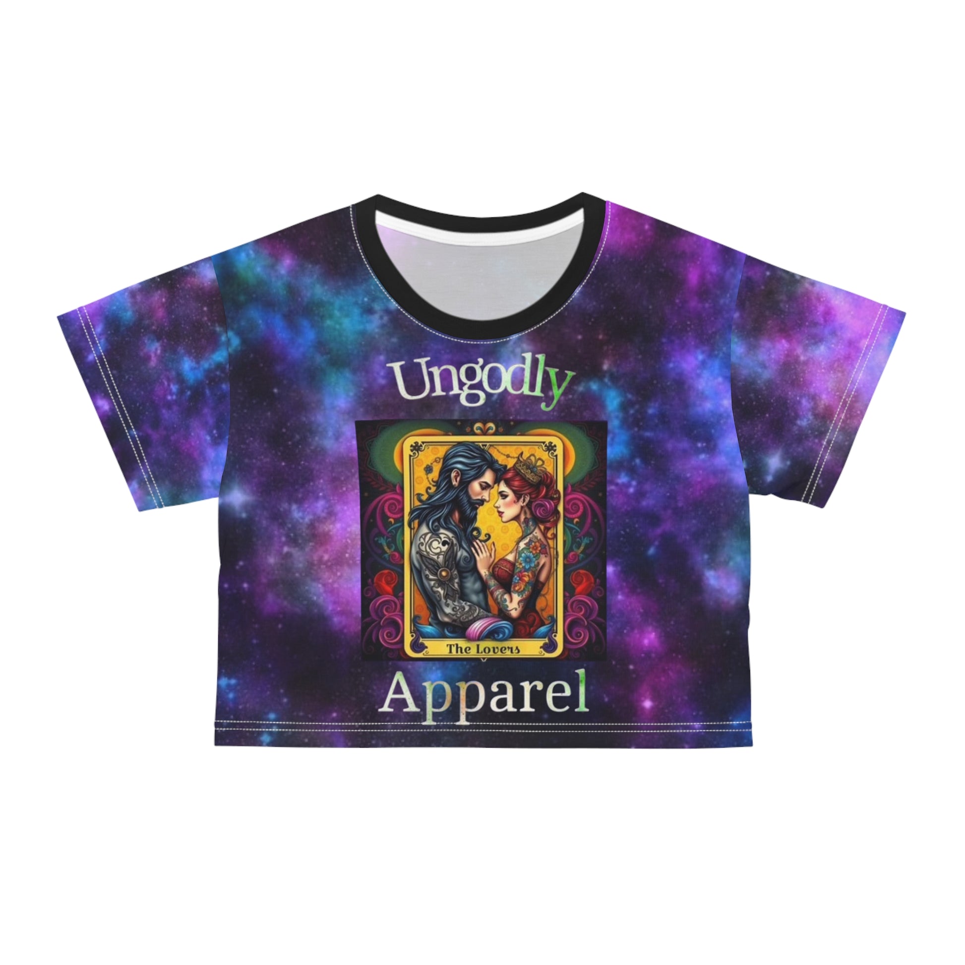 Tarot Lovers Galaxy Crop Tee — "Ungodly Apparel" Cosmic Tarot Graphic