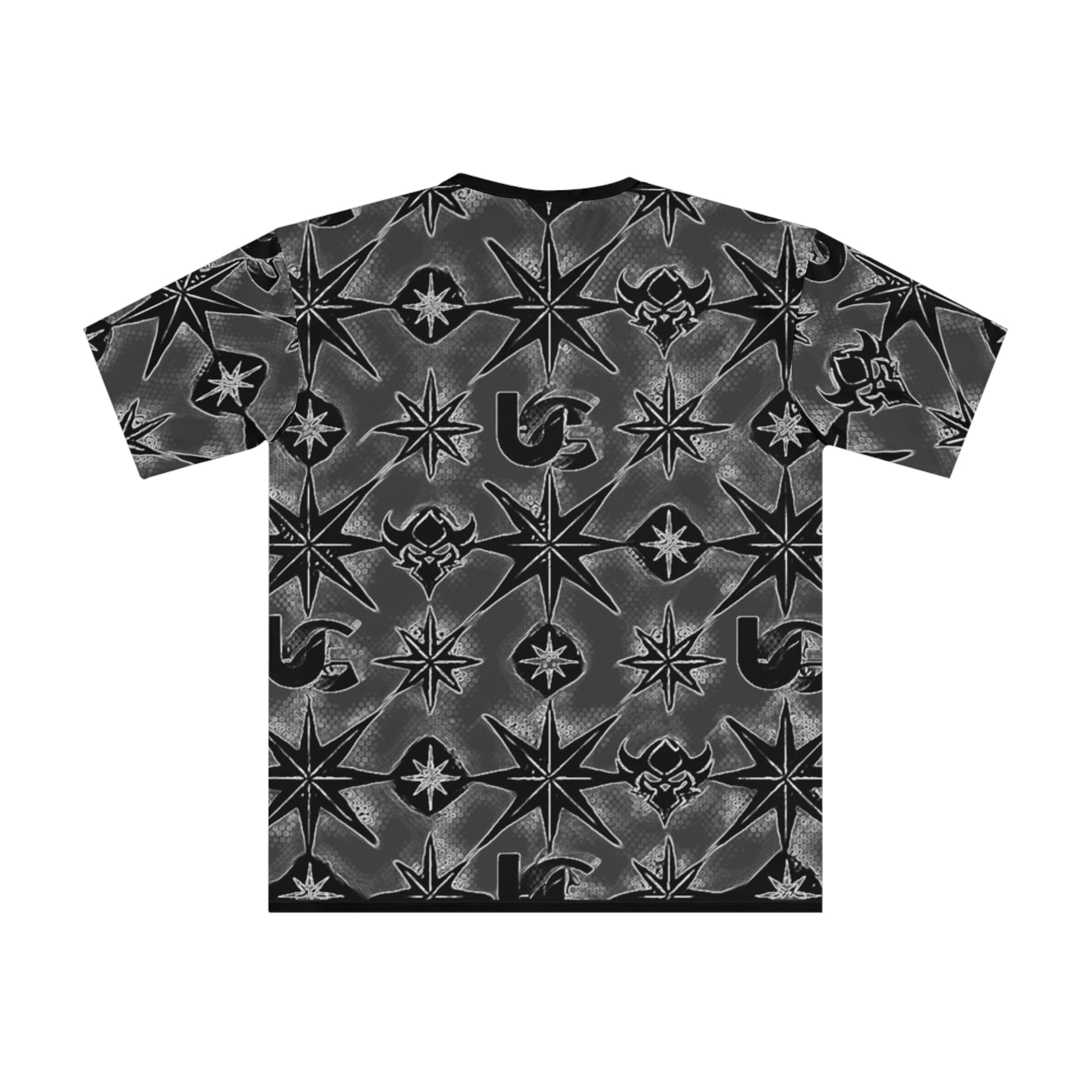 A bold, all-over printed tee that wears like a statement. The deep charcoal background and high-contrast black-and-silver motif give this shirt a moody, urban vibe — think late-night streets, overhead neon reflections, and an edge of industrial mystery. Lightweight and slightly stretchy, it drapes easily for relaxed movement and keeps the print uninterrupted across front, back and sleeves. Wear it to skate nights, underground shows, or when you want an outfit that reads as intentional and a little fierce. The round neckline and clean double-stitched hems keep the silhouette classic while the repeating star-and-symbol pattern does the talking.