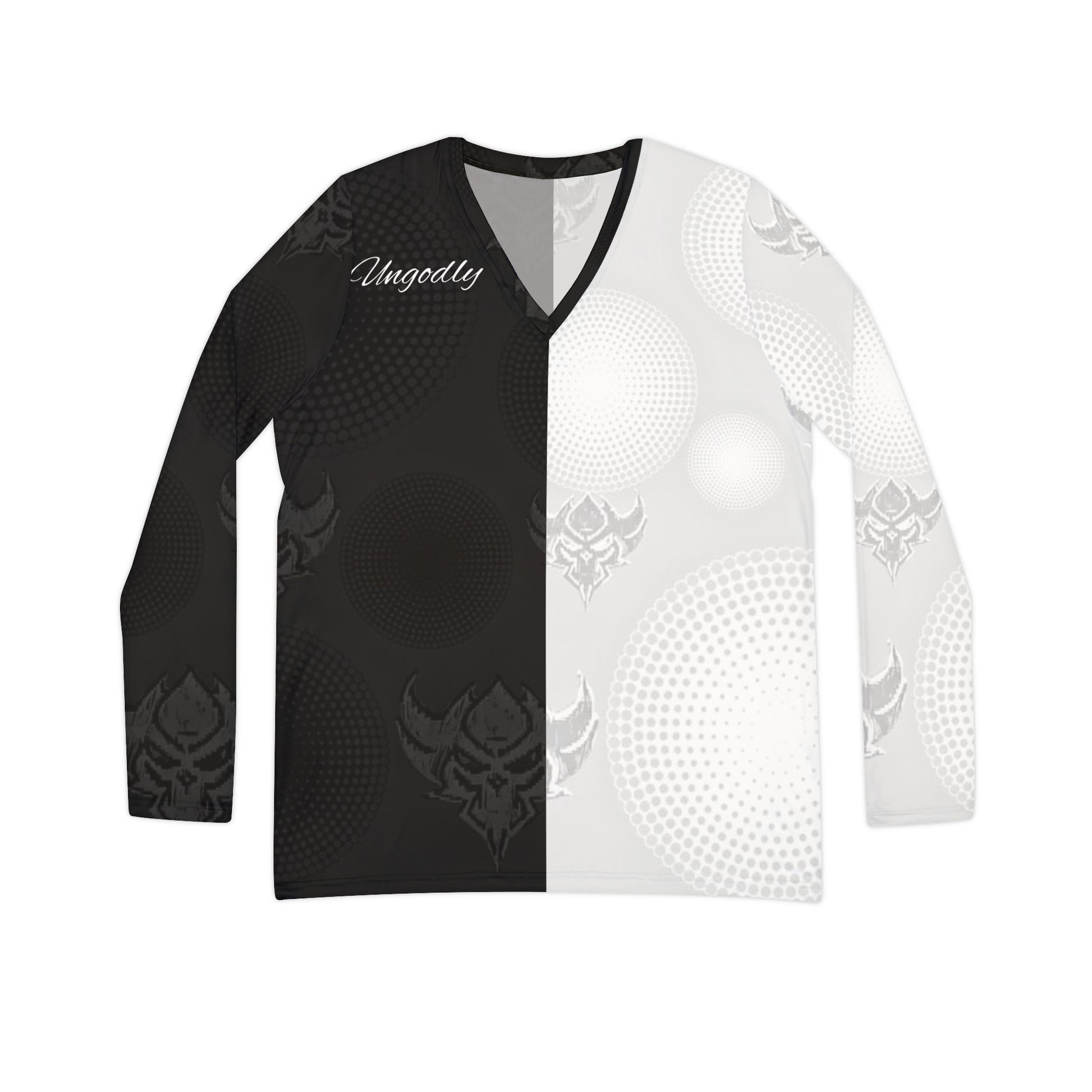 "Ungodly Apparel logo" Women's V-Neck Long Sleeve Shirt — Monochrome Gothic Split-Pattern Design