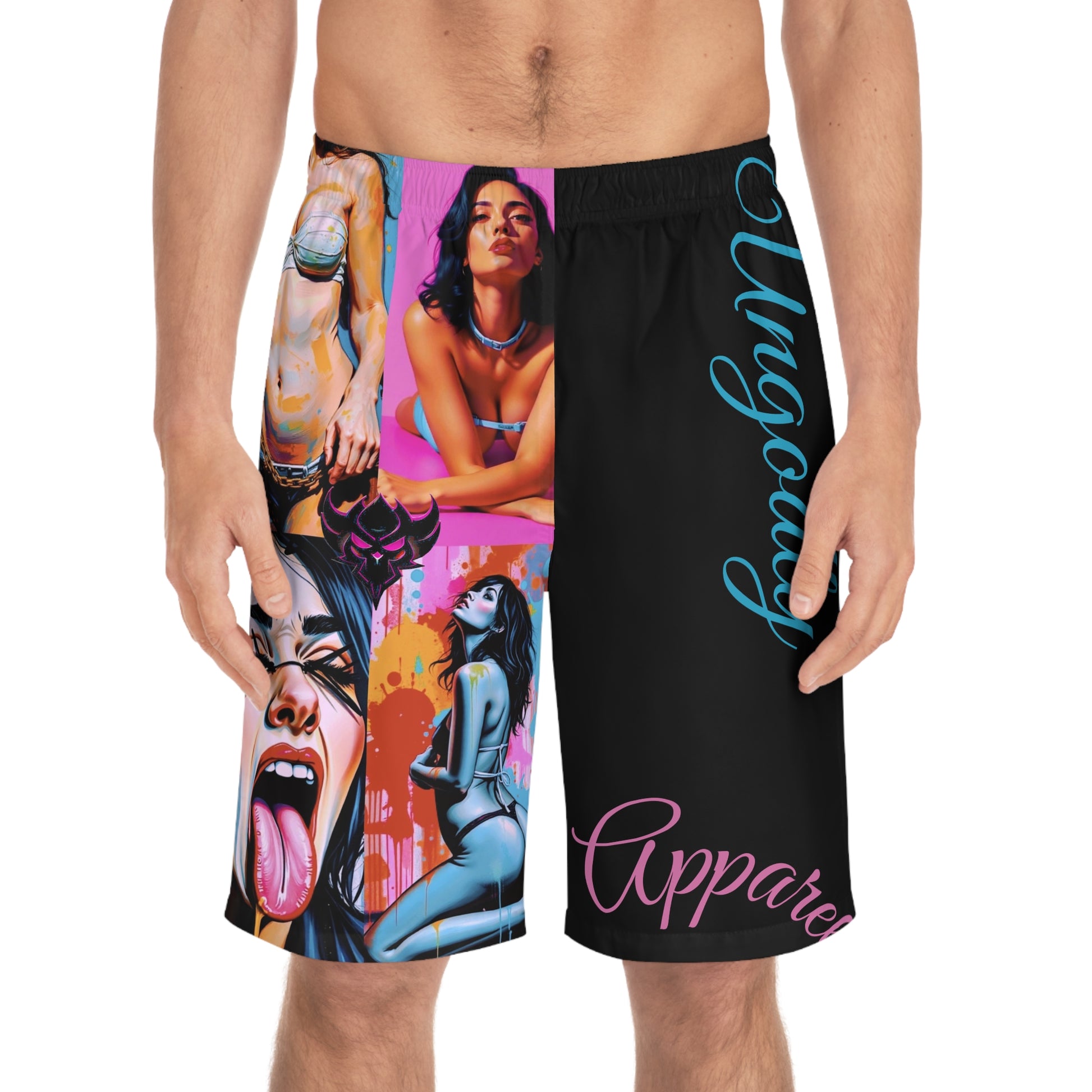 "Ungodly Fetish Board Shorts" Bold Graphic Board Shorts - Trendy Swimwear for Beach Days, Summer Fun, Pool Parties, or Vacation Style - Ungodly Apparel