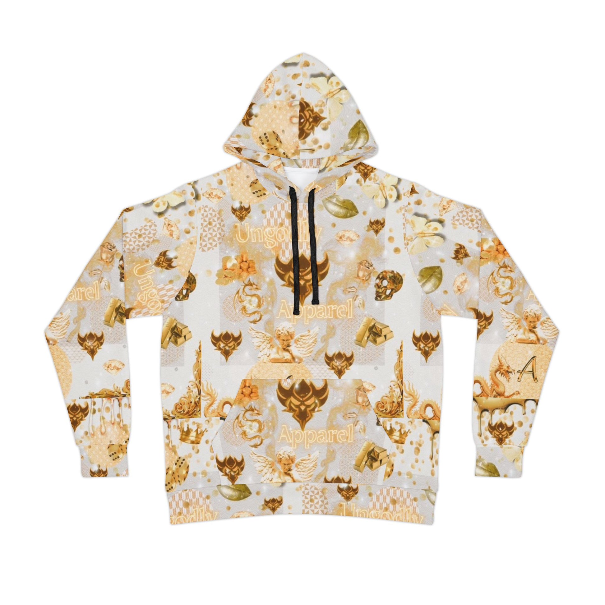 "Ungodly Gold" Gold Skull Pattern Athletic Hoodie – All-Over Print Streetwear