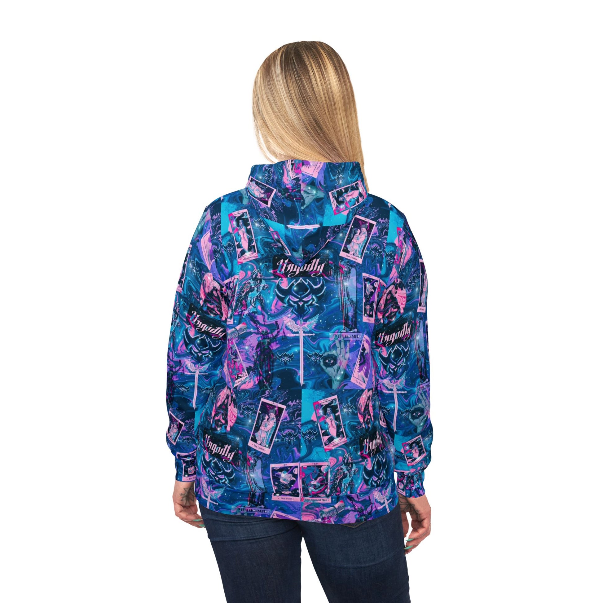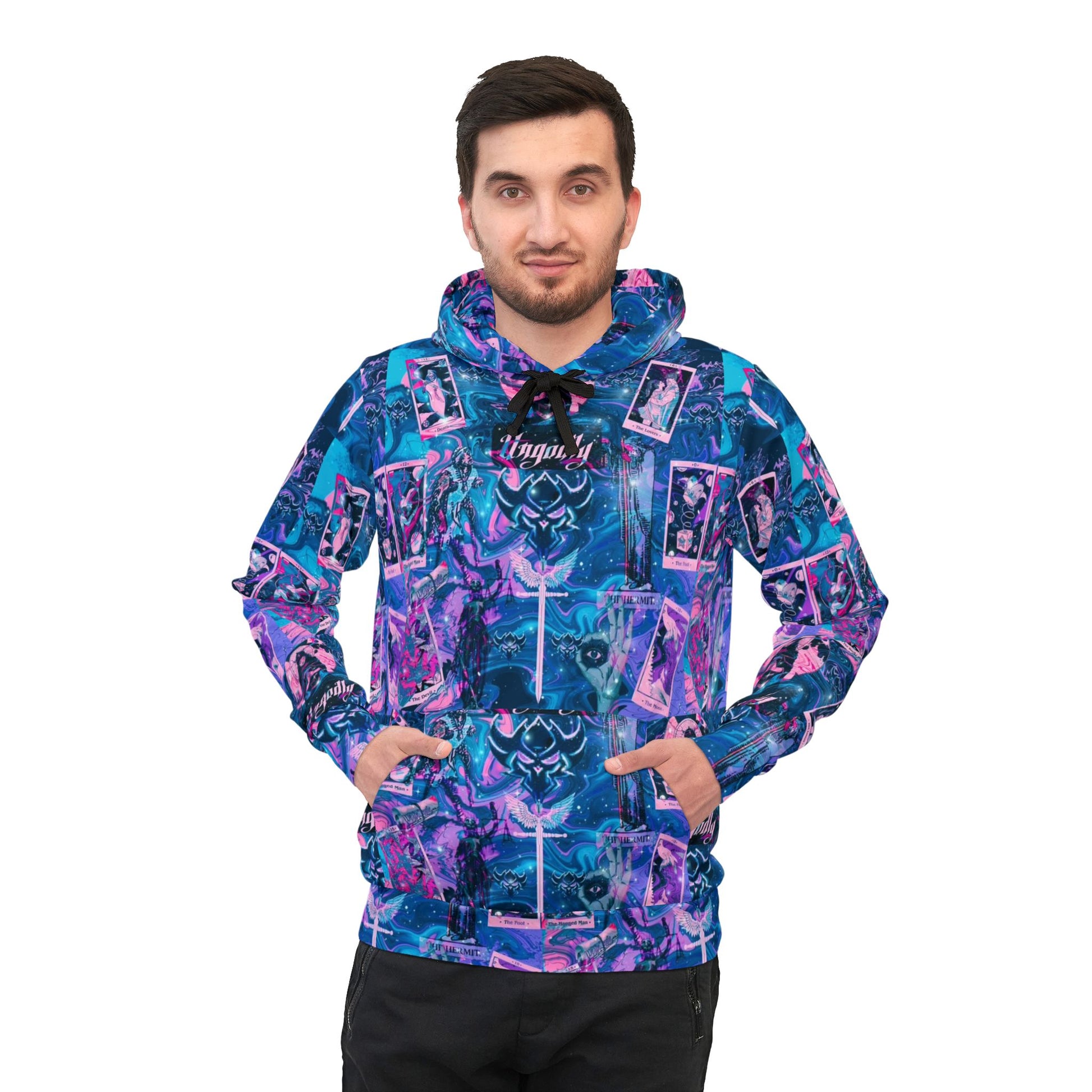 "Ungodly Tarot" All-Over Print Retro Collage Athletic Unisex Hoodie — Neon Purple & Teal Streetwear