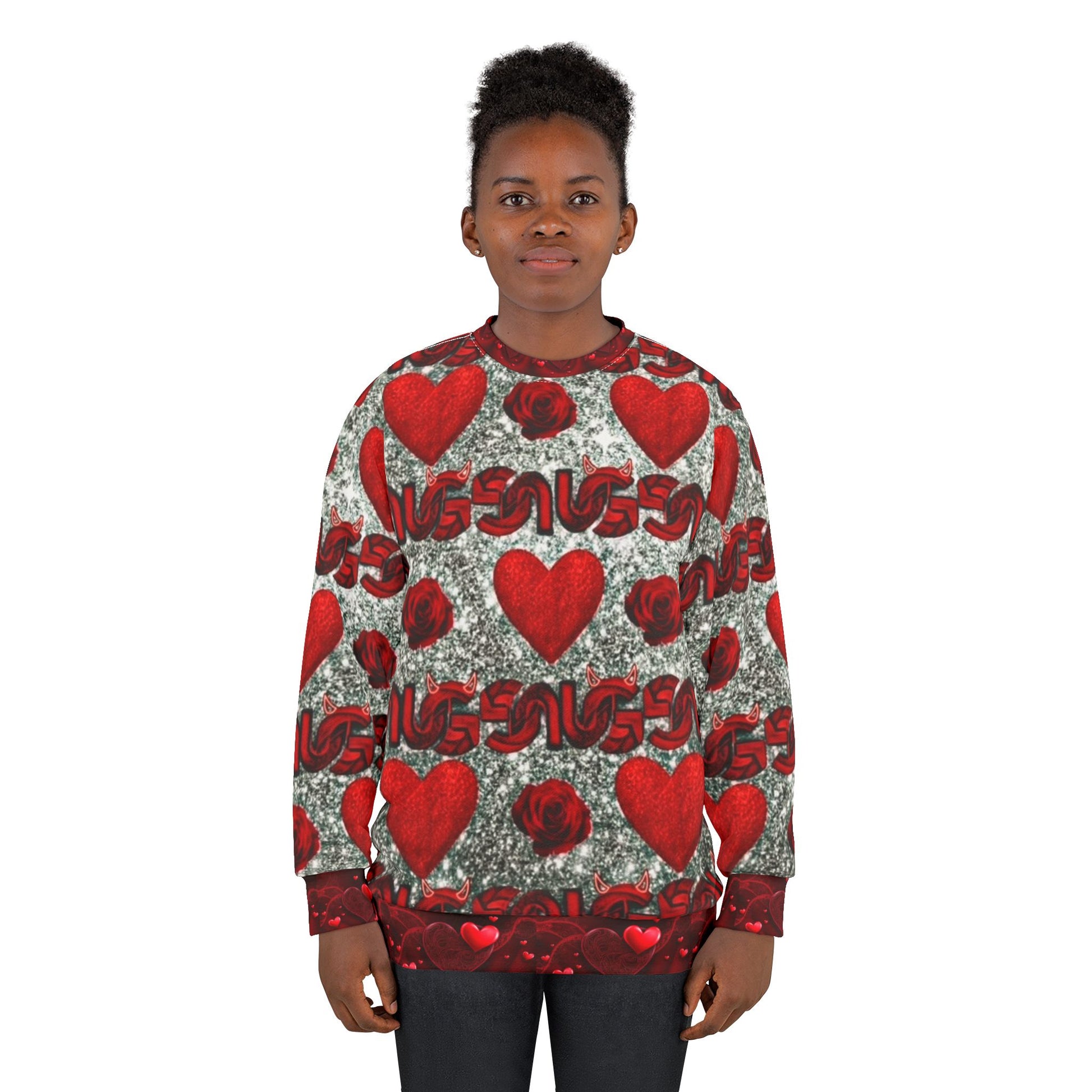 This cozy crewneck brings a bold, all-over romance to your everyday wardrobe. Plush red hearts and scattered roses float over a textured gray backdrop, wrapping the body in a vivid pattern that reads like a hand-painted love letter. The medium-weight polyester keeps the print vibrant and the sweatshirt structured, while ribbed cuffs and collar hold shape through wear. Wear it when you want to send a clear, playful message — whether you’re brunching with friends, wandering a winter market, or curling up with a book and a mug. It’s relaxed and graphic, a statement layer that feels personal and a little mischievous.
