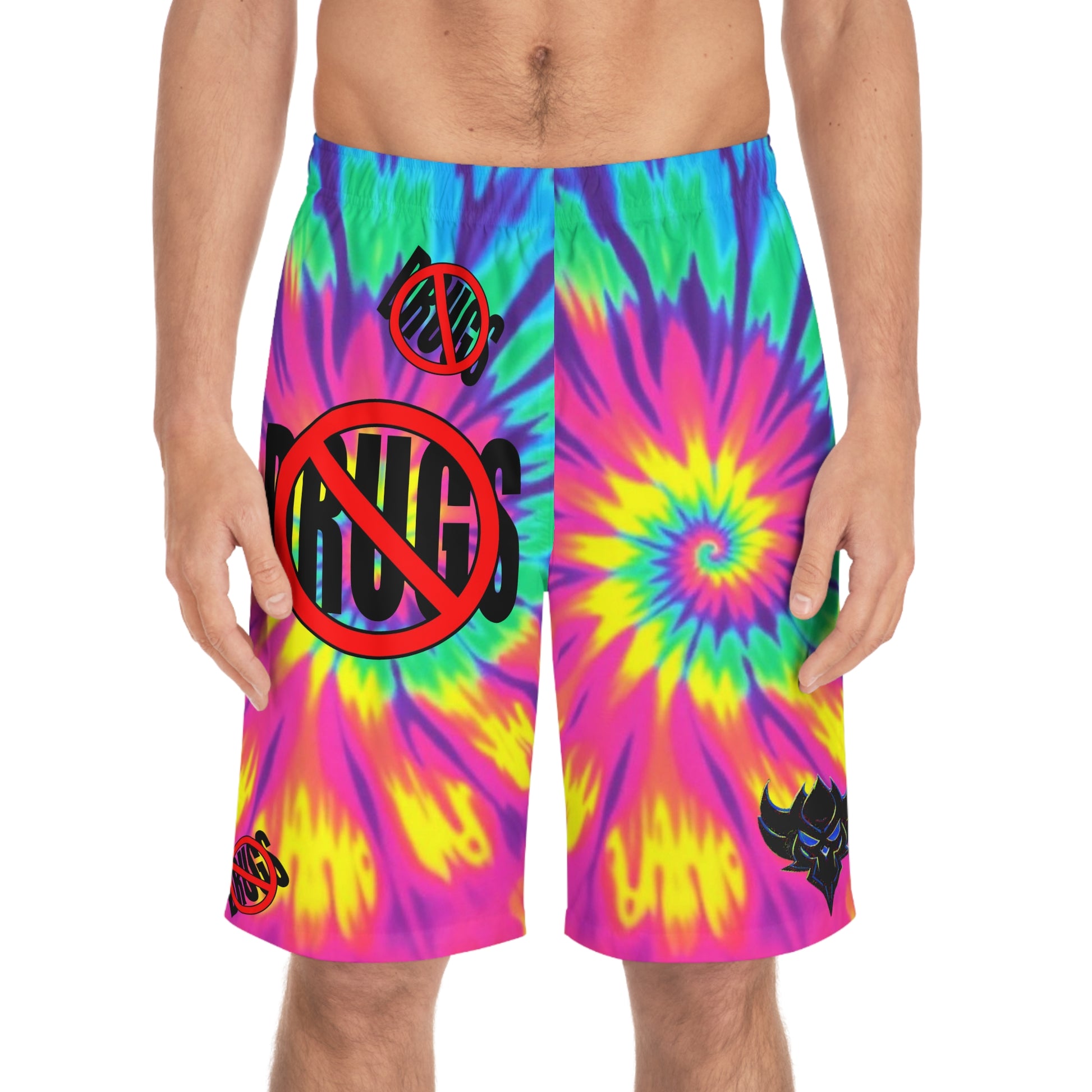 Vibrant Tie-Dye Board Shorts with 'No Drugs' Design, Summer Swimwear, Beachwear, Festival Shorts, Men's Casual Shorts, Colorful Swim Trunks