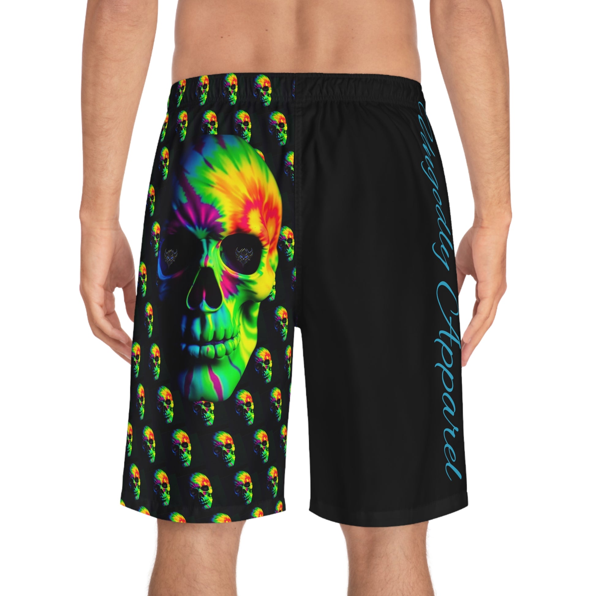 Vibrant "Ungodly" Skull Print Board Shorts, Summer Swim Trunks, Beach Wear, Festival Apparel, Men's Swim Shorts for Parties